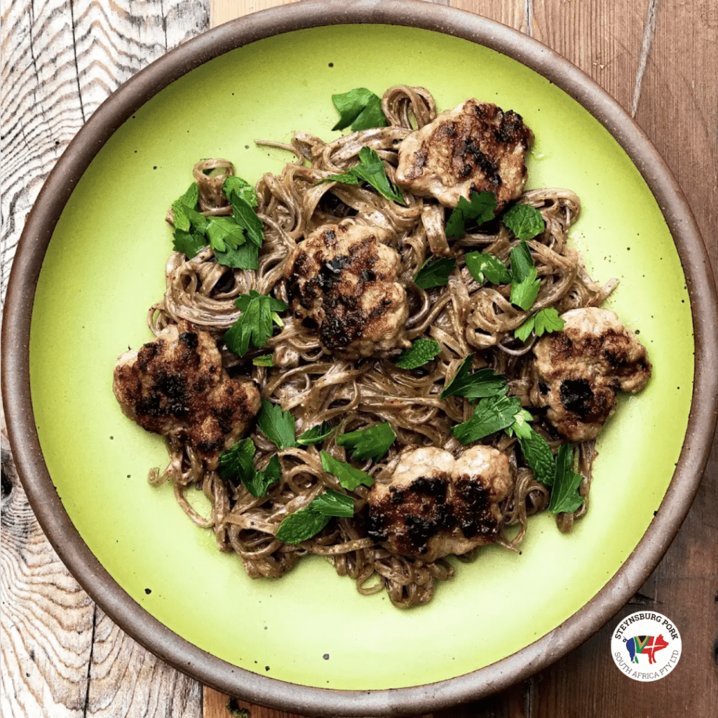 Grilled Lemongrass Pork Meatballs with Crack Noodles
