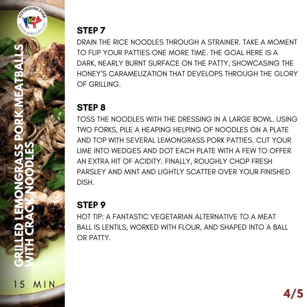Toss the noodles with the dressing in a large bowl. Using two forks, pile a heaping helping of noodles on a plate and top with several lemongrass pork patties. Cut your lime into wedges and dot each plate with a few to offer an extra hit of acidity. Finally, roughly chop fresh parsley and mint and lightly scatter over your finished dish.