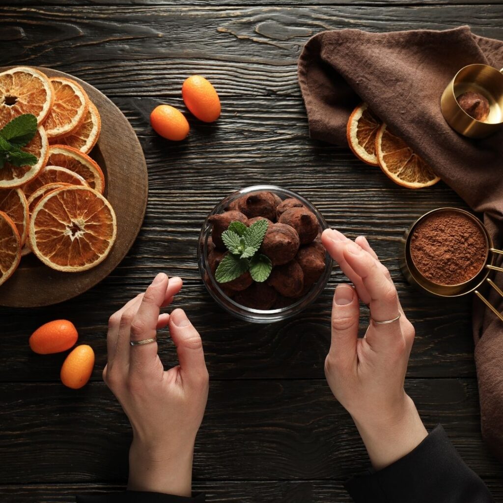 Once the chocolate coating is set, dust the truffles with cocoa powder for a velvety finish.