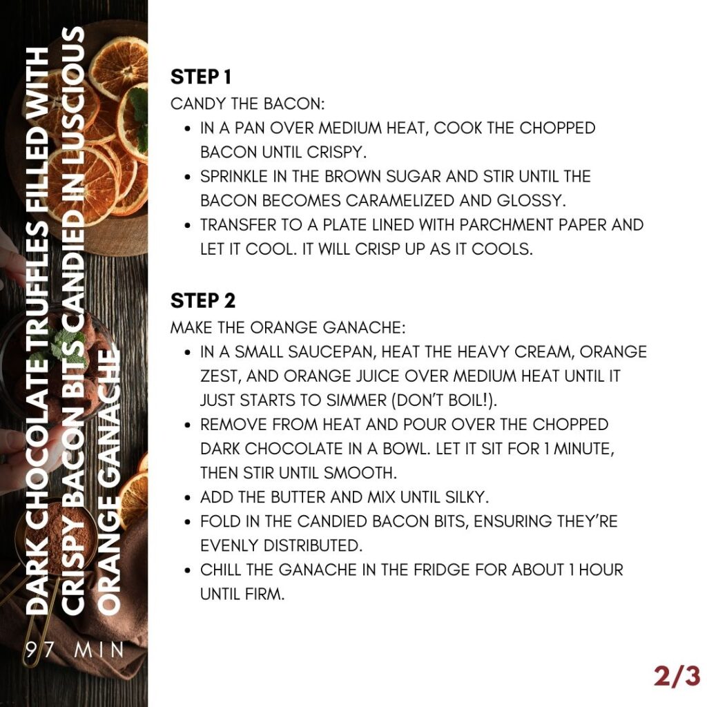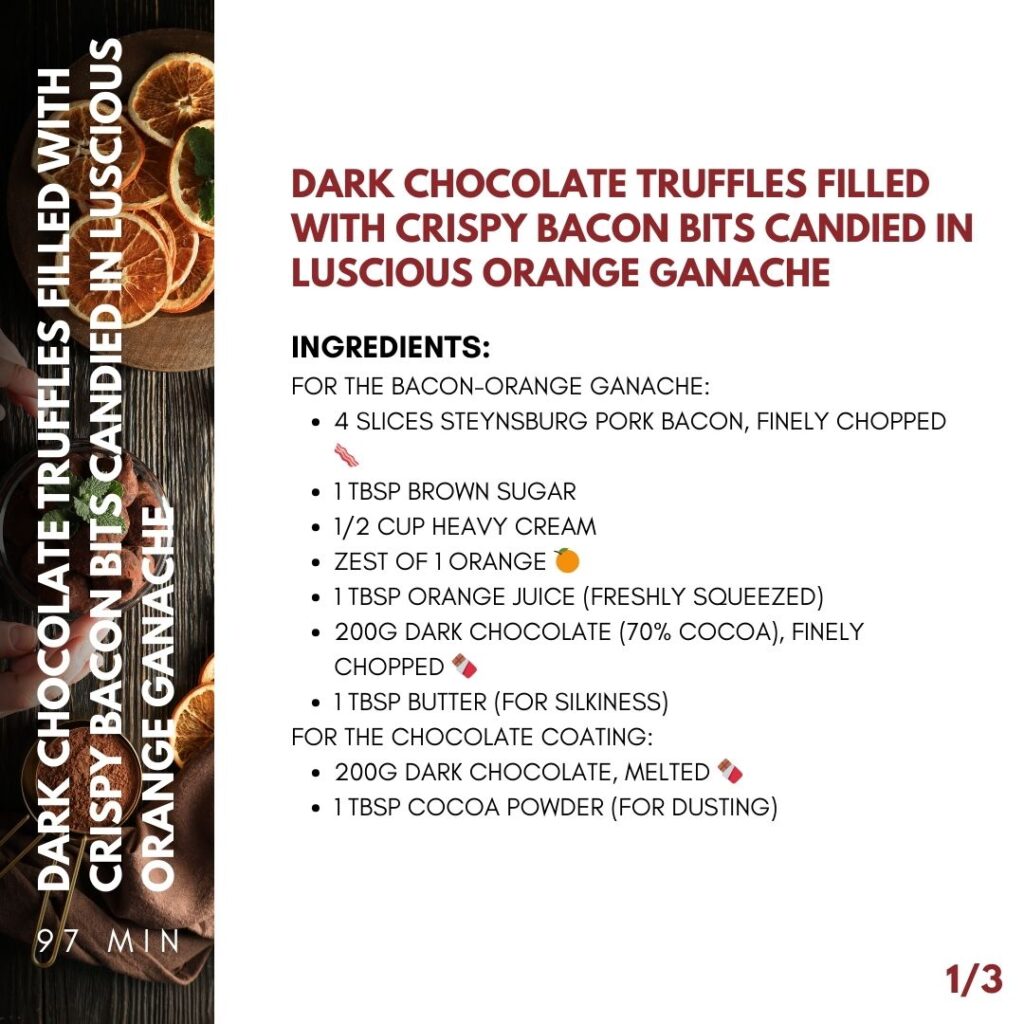 A luxurious dark chocolate truffle with a burst of orange-citrus freshness, the deep richness of chocolate, and a crunchy, salty-sweet bacon surprise in every bite. 😍