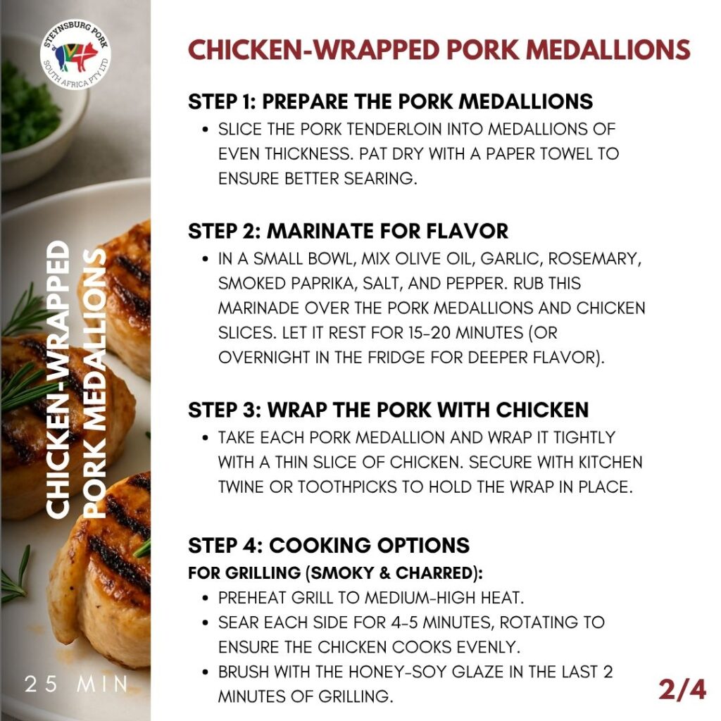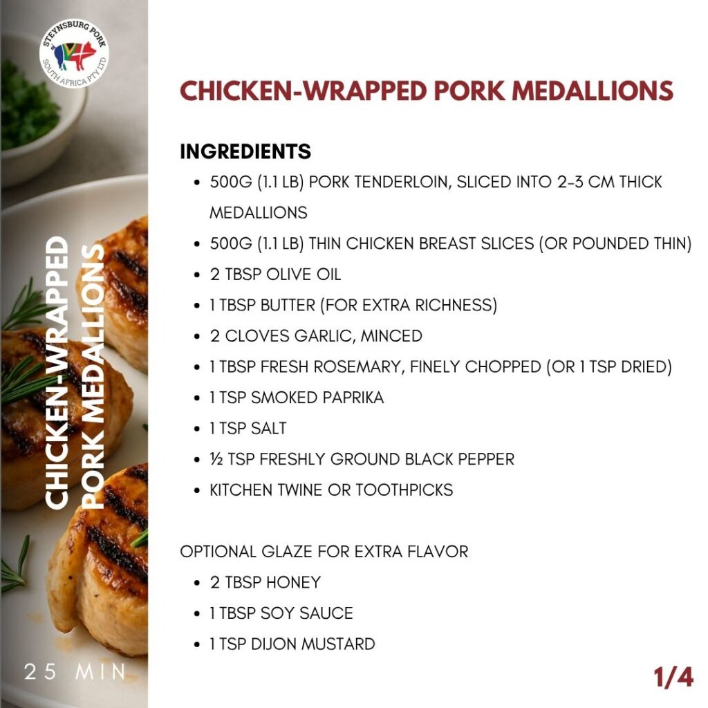 In a small bowl, mix olive oil, garlic, rosemary, smoked paprika, salt, and pepper. Rub this marinade over the pork medallions and chicken slices. Let it rest for 15–20 minutes (or overnight in the fridge for deeper flavor).