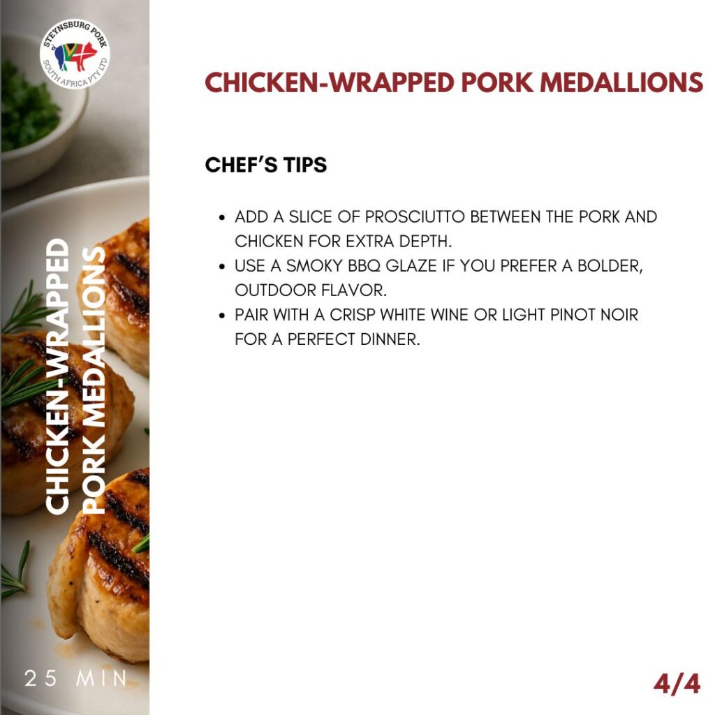 Take each pork medallion and wrap it tightly with a thin slice of chicken. Secure with kitchen twine or toothpicks to hold the wrap in place.