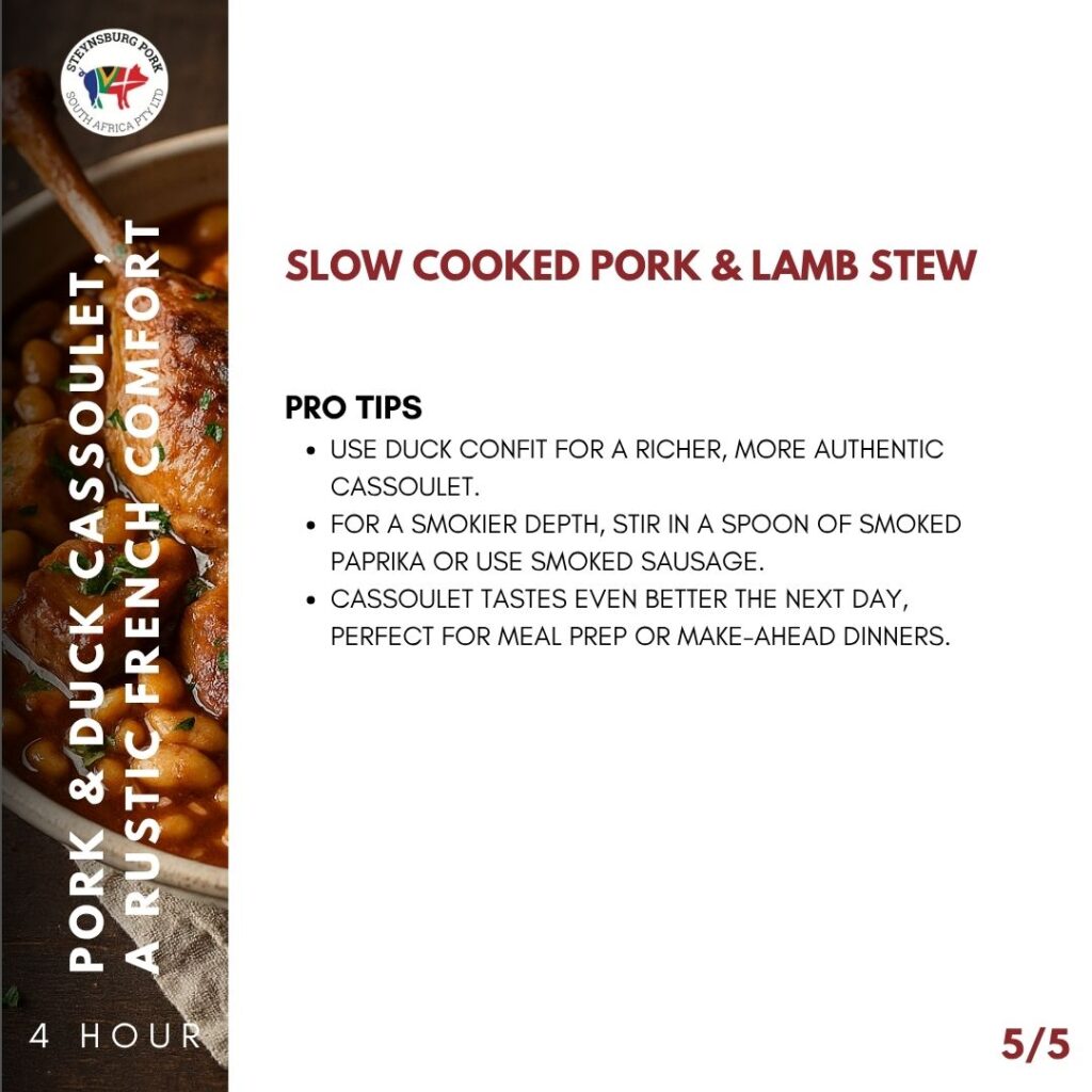 • Cover and simmer gently on low heat for 2½–3 hours (or bake at 150°C / 300°F), stirring occasionally, until meats are tender and flavors have melded.