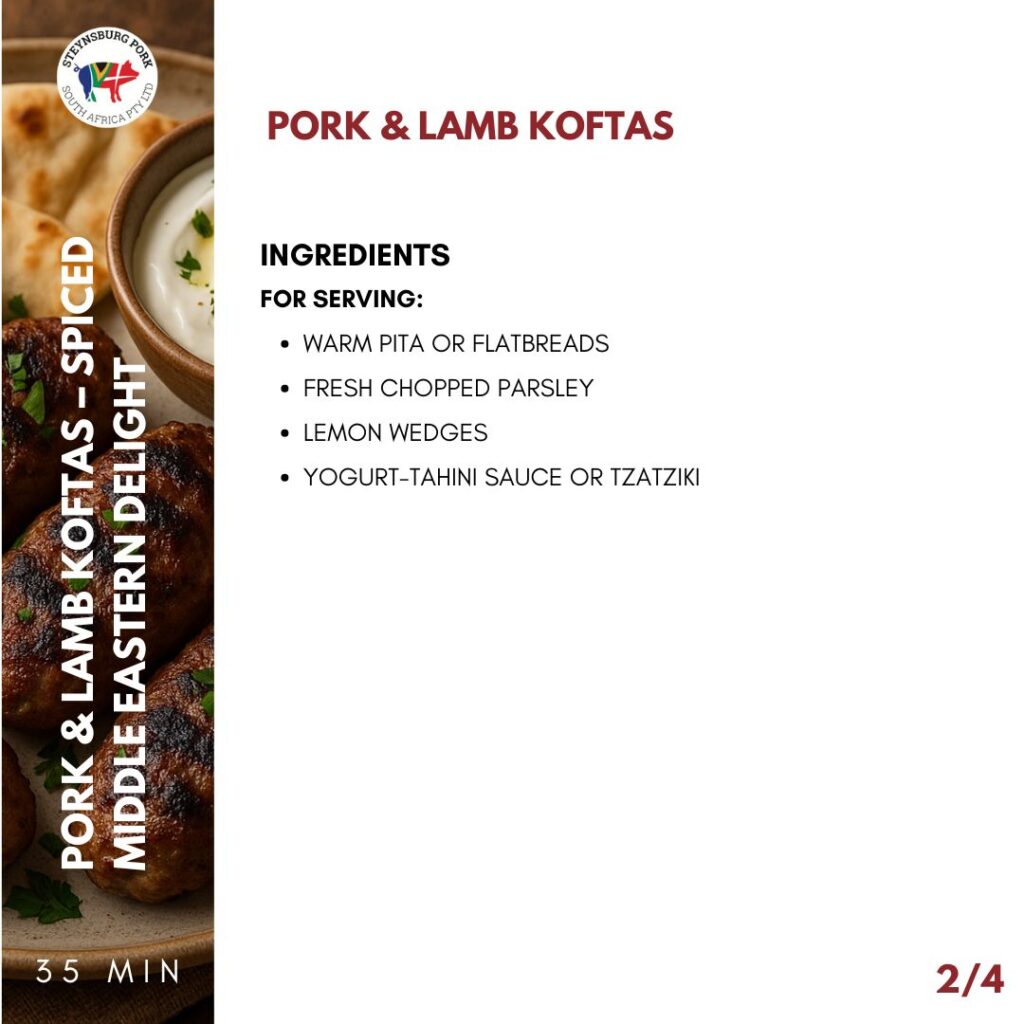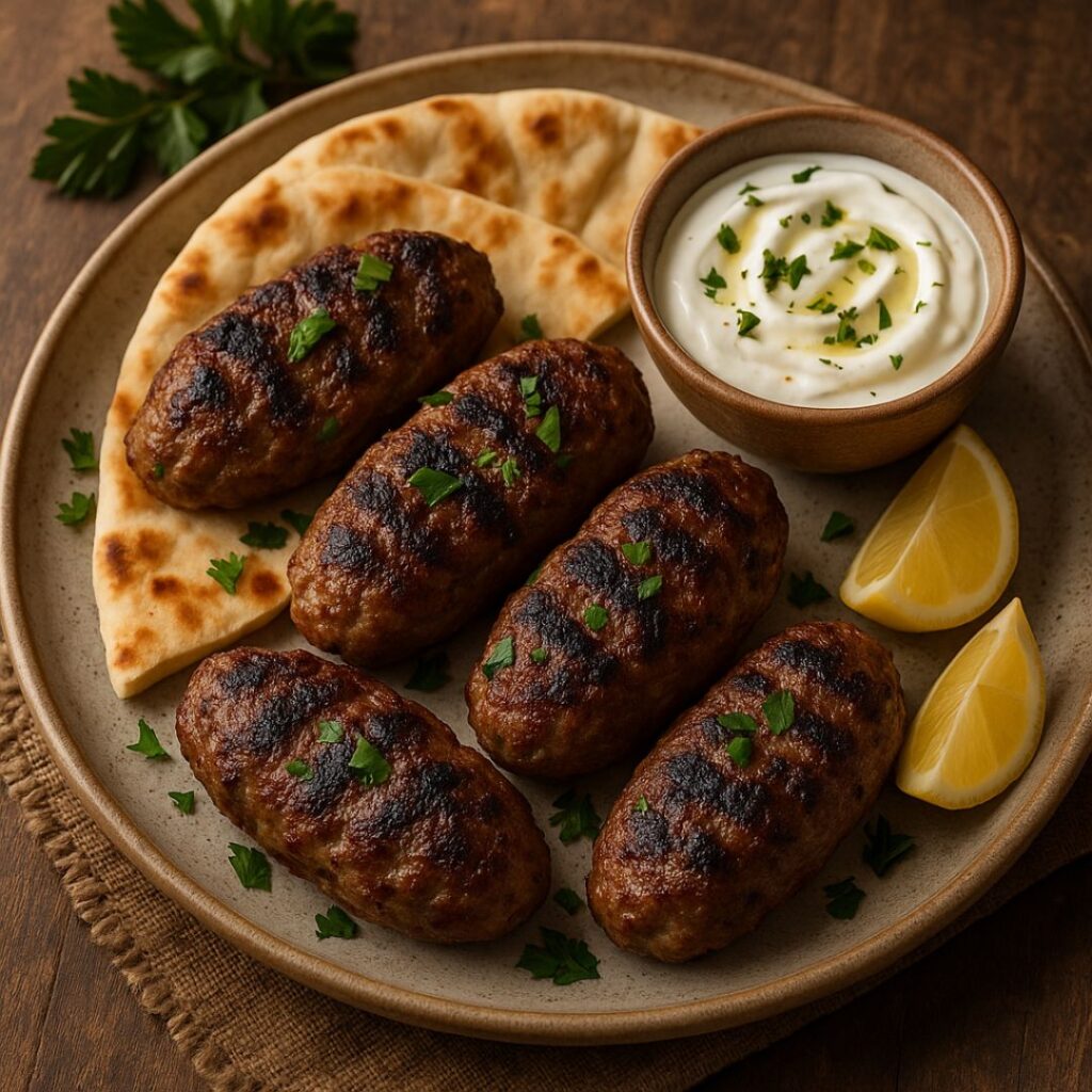 Place koftas on a platter with warm pita, fresh parsley, lemon wedges, and a drizzle of yogurt-tahini or tzatziki sauce.
